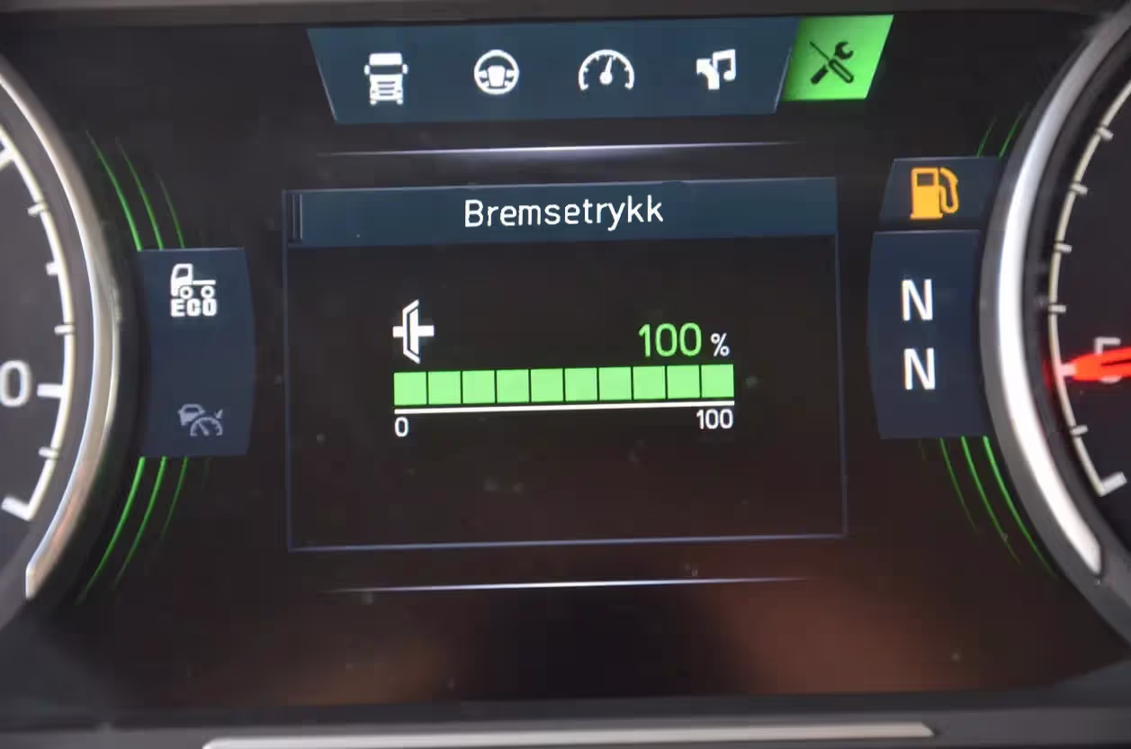 BREMSER: BEREGNINGSTRYKK BRESMER 8,0 BAR; MASSER OG DIMENSJONER (UTENOM M)FØRING INNTIL 16,9 TONN TILLATT BENYTTET INNTIL 60 KM/T SPESIFISERT MED KODE FPC13AKSEL 4 ER FRIKSJONSSTYRT (MEDSPORENDE)Spørsmål 3 av 5